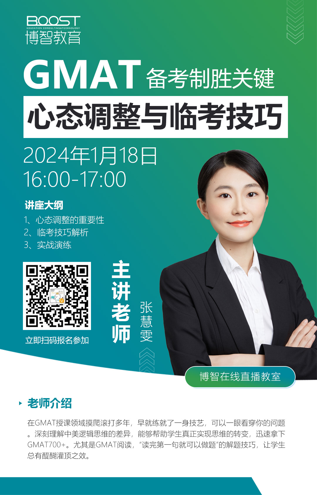 GMAT考试有着自己的做题规则和备考方法,如果你想要趁早在短时间内快速攻克GMAT,那么调整心态和掌握临场技巧十分关键!1月18号下午4点,小智特邀张慧雯老师教你如何调整心态,以积极态度面对考试;分享实用临考技巧,让你从容应对各种题型和时间压力。不管你是GMAT小白还是正在备考的学生,相信听了都会有很大的收获!
