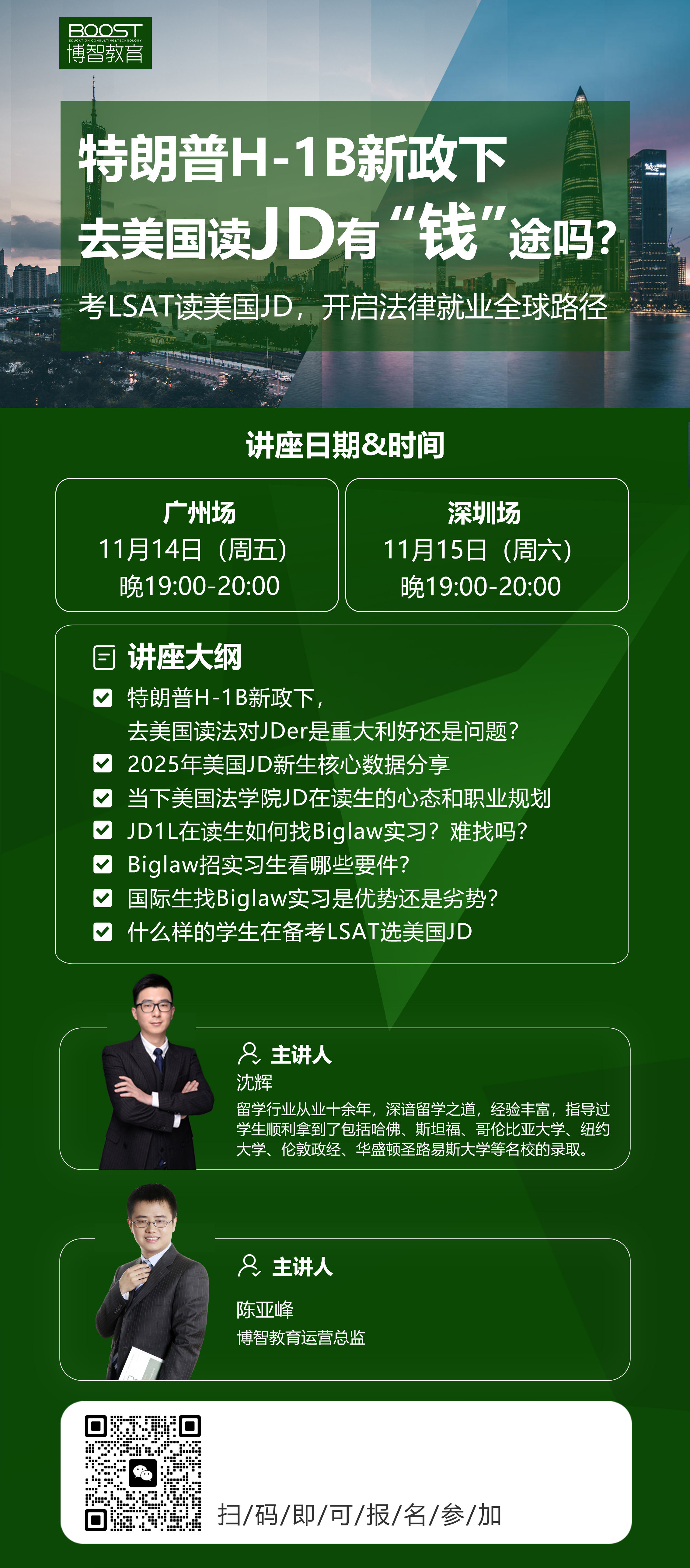 近年美国 H - 1B 签证政策调整,让不少计划赴美攻读JD的同学犯了难:现在去美国读 JD,还能顺利留美就业、收获高薪吗?考 LSAT、申顶尖法学院,这条路径还值得走吗?为解答这些困惑,博智教育特别推出广州、深圳两场线下讲座,聚焦 “特朗普 H - 1B 新政下,美国 JD 的‘钱’途与法律就业全球路径”,深度拆解留学与职业发展的核心问题!