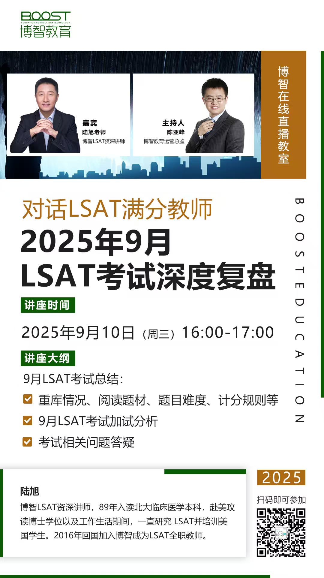 本次讲座将总结2025年(nian)9月LSAT考(kao)试(shi)!陆旭(xu)老师将为大家分析重库(ku)情况、阅读题(ti)(ti)材、题(ti)(ti)目难(nan)度、计分规则等(deng),并深入剖析考试加(jia)试部分,此外(wai),陆旭(xu)老师也会给同学们解答(da)考试相(xiang)关问题(ti)(ti),参加(jia)请及时联系我(wo)哦!
