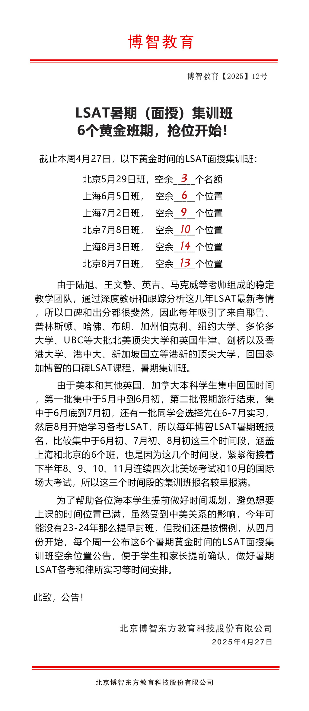 余位更新【博智LSAT暑期(面授)集训班6个黄金班期,要抢位啦】
